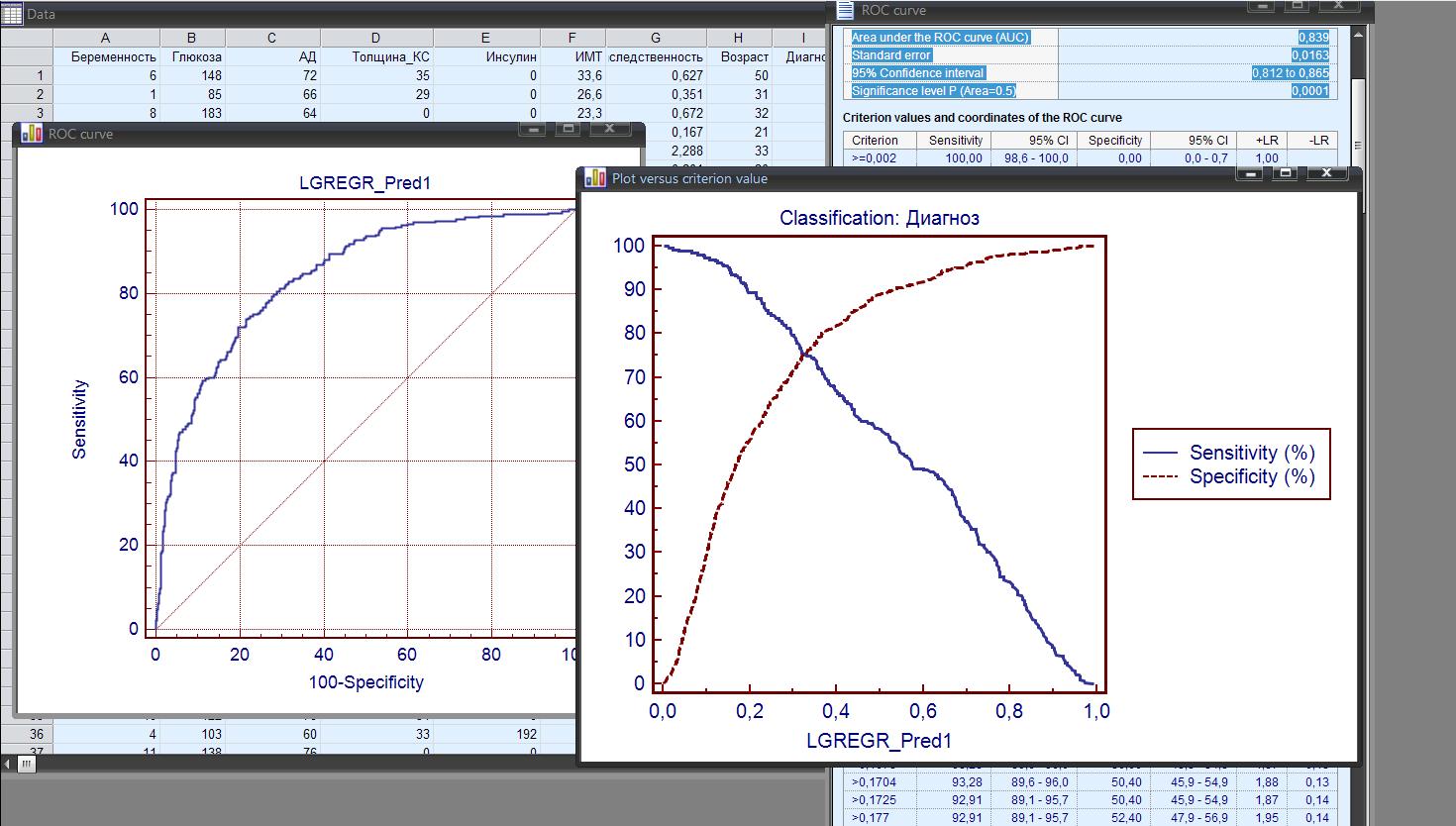 Во второй из указанных статей используется массив медицинских данных из общедоступного источника. Я его (массив) нашел и скачал, потому прилагаю в виде тестового файла. Можно легко импортировать в Excel и посчитать в AtteStat.