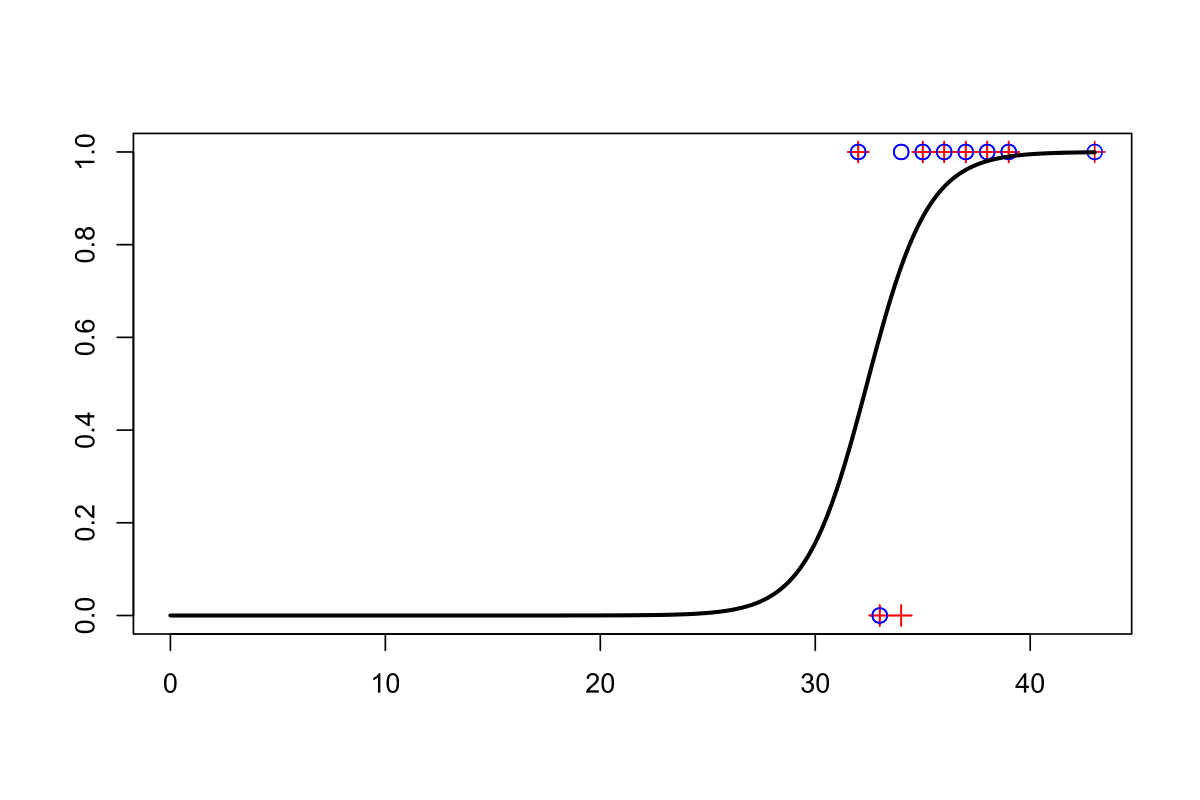 x y 32 1 32 1 33 0 33 0 34 1 34 0 35 1 35 1 36 1 36 1 37 1 37 1 38 1 38 1 39 1 39 1 43 1 43 1 И даже уже есть иллюстрация логистической регрессии y по x. На форму и цвет маркеров внимания не обращайте, это не имеет отношение к модели по которой построен сигмоид. Также на картинке нет ДИ, но он просто ужасен - в начальной точке простирается от 0 до 1. А хочется чтобы сходился в ноль (или, по крайней мере в очень малую величину практически неотличимую от нуля, раз уж логистическая модель строго в ноль не может, равно как и альтернативные пробит, клоглог, и что там еще...) . Потому что есть теоретические (за рамками статистики) основания считать, что при x=0 вероятность события нулевая. |