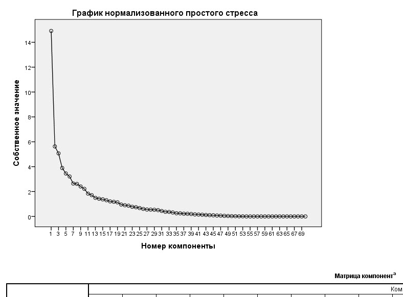 и снова здравствуйте. Скажите, как можно объяснить,что график нормализованного стресса такой странный. На нем не видно точку перегиба, а соответственно мне сложно понять сколько брать факторов. Таблица полной объясненной дисперсии показывает 19 компонент, но это ерунда какая-то. Вообще из-за чего такое может быть.