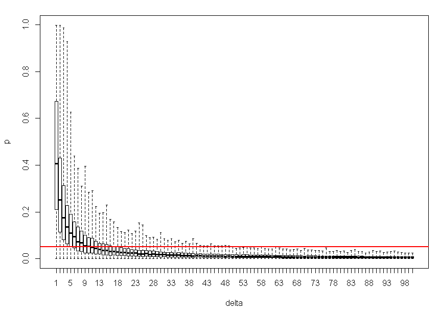 n1=1 - вполне себе встречающийся на практике случай, но только если n2>1. Чисто теоретически, в сфероконном случае статистика начинается с n1=1 b n2=2 (что б было, где дисперсию считать). Стало интересно, как в таких условиях себя покажет критерий Стьюдента при выполнении всех допущений (в том числе о равенстве дисперсий, поскольку даже чисто теоретически тут различия в дисперсиях оценить невозможно). К сожалению функция power.t.test() работает только с одинаковыми n. Но можно помоделировать красивее: Код d<-1 p<-replicate(1000, t.test(rnorm(2, 0, 1), rnorm(1, d, 1),var.eq=T)$p.value) delta<-rep(d, 1000) res<-data.frame(delta, p) mean_p1<-mean(p) mean_p<-rep(NA, 99) for (i in 1:99) { d<-d+1 p<-replicate(1000, t.test(rnorm(2, 0, 1), rnorm(1, d, 1),var.eq=T)$p.value) mean_p[i]<-mean(p) delta<-rep(d, 1000) res_<-data.frame(delta, p) res<-rbind(res, res_) } boxplot(p~delta, data=res, range=0) abline(0.05,0, lwd=2, col="red") Вывод: после величины эффекта, равной 12 сигмам, нулевая гипотеза вероятнее будет отклонена на пятипроцентном уровне значимости, чем принята. А после разницы в 18 сигм критерий работает уже достаточно уверенно. Увы с однопроцентным уровнем сильно хуже: можете нарисовать abline(0.01, 0) и поплакать над ней. Сообщение отредактировал ИНО - 23.06.2022 - 04:57 |