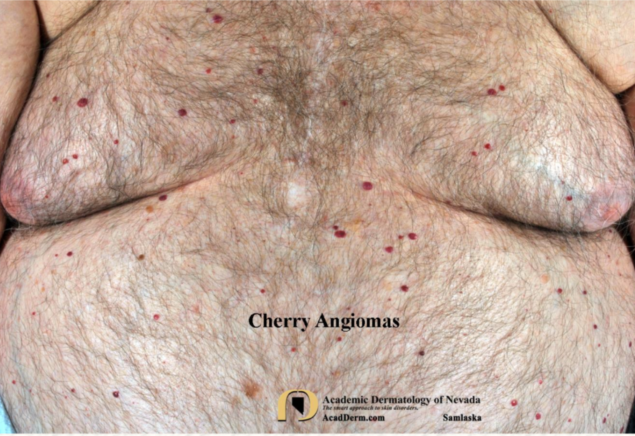 Интересное фото сопровождающее статью посвященную вишнёвым ангиомам или сенильным ангиомам привлекло моё внимание. Статью писал явно врач-дерматолог. Не буду ее пересказывать. Кто хочет прочитать, вот ссылка https://acadderm.com/cherry-angioma-senile-angioma/ Кроме множества самих ангиом лоцирующихся на груди и животе, обращает на себя внимание явная гинекомастия и визуализируются подкожные вены живота, что наводит на мысль о вероятной портальной гипертензии. Если предположить, что связь между вишнёвыми ангиомами и портальной гипертензией существует, то вероятный механизм образования вишнёвых ангиом можно объяснить, например, не только повышением портального давления и коллатерализацией кровотока через подкожные вены живота, но и, возможно, гормональным дисбалансом и действием эстрогенов на фоне печеночной патологии. Связь вишневых ангиом с панкреатитом, на мой взгляд, скорее всего случайная. По крайней мере, нужны дополнительные наблюдения, чтобы исследовать причины их появления.