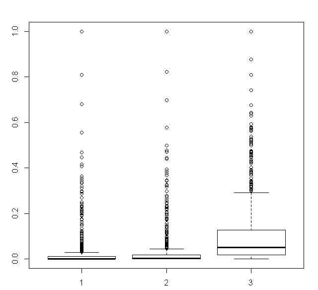 Код pr1<-rep(1, 50) pr2<-rep(2, 50) pr<-as.factor(c(pr1, pr2)) TestPoisReg2<-function(pr) { resp1<-rpospois(50, 0.6) resp2<-rpospois(50, 1.35) resp<-c(resp1, resp2) df<-data.frame(pr, resp) df$modresp<-df$resp-1 mod1<-glm(modresp~pr, data=df, family="poisson") prediction1<-predict(mod1, type="response")+1 p1<-coef(summary(mod1))[2,4] mod2<-vglm(resp~pr, data=df, family="pospoisson") p2<-coef(summary(mod2))[2,4] mod3<-glm(resp~pr, data=df, family="poisson") p3<-coef(summary(mod3))[2,4] return(c(p1, p2, p3)) } x<-replicate(1000, TestPoisReg2(pr=pr)) p1<-x[1,] p2<-x[2,] p3<-x[3,] boxplot(p1, p2, p3) Ну, третью модель (обычный Пуассон) можно отправлять сразу в мусорное ведро, потому что она пытается предсказать нули, которых нет, построенные по ней ДИ будут невозможными, соответственно и p тоже должно быть неправильное. А вот как сделать выбор между ?1 и ?2, понять какая из них больше врет в данном случае, я покамест не сообразил. Буду благодарен за подсказку. И все ж странно, почему при таких серьезных различиях в объясняющей составляющей (которая была ожидаема), в составляющей прогностической все три модели оказались практически одинаковыми. Сообщение отредактировал ИНО - 21.11.2022 - 18:33 |