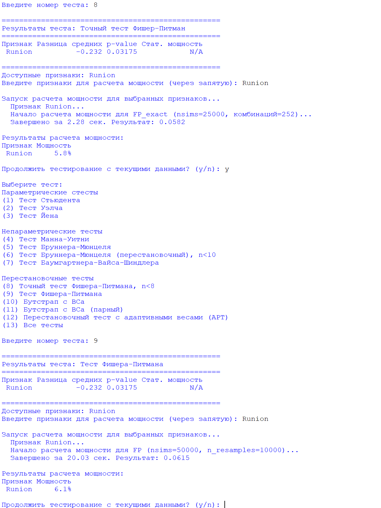 А в вашем примере объём выборок равен 5! Моя программа посчитала всё верно, приложил принтскрин. p=0,03175 что при расчёте точного критерия, что при использовании метода Монте-Карло, но на малых выборках оно так и должно быть, потому как число перестановок (у меня по умолчанию 100000) намного больше числа возможных комбинаций (252) Мощность, конечно, маловата, около 6% Сообщение отредактировал Vitek_22 - 9.08.2025 - 13:10 |