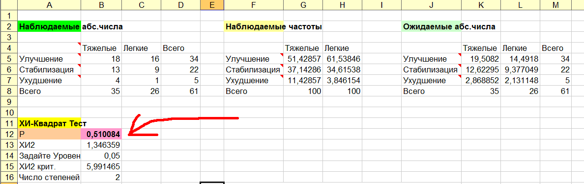 Используя могучую программу http://doctorstat.narod.ru/ и критерий сравнения хи-квадрат, получаем, что доли пациентов с улучшением, стабилизацией, ухудшением в 2-х группах больных (тяжелые и легкие) на уровне значимости alfa=0,05 не отличаются, т.к. вычисленный уровень значимости отличий p-value=0,51>0,05. Смотри распечатку программы на приложенном рисунке. Хотя в данном случае хи-квадрат применять не совсем корректно, ибо имеются проблемы аппроксимации хи-квадрат, точные методы дают примерно те же значения: критерий Фримана-Холтона (точный) p = 0,48959 критерий Фримана-Холтона (Монте-Карло, 1 млн. таблиц) p = 0 ,465469 Только анализировались этими методами (также и хи-квадрат) не различия между подгруппами, а зависимость между переменной - тяжесть заболевания (номинальная - 2 градации) - и переменной - результат лечения (номинальная - 3 градации). Данные нужно занести в таблицу сопряжённости ... Kruskal-Wallis statistics Не понял, при чем тут Краскел-Уоллис, если обрабатывается таблица сопряженности? Сообщение отредактировал Игорь - 26.08.2009 - 12:08 ![]() Ebsignasnan prei wissant Deiws ainat! As gijwans! Sta ast stas arwis!