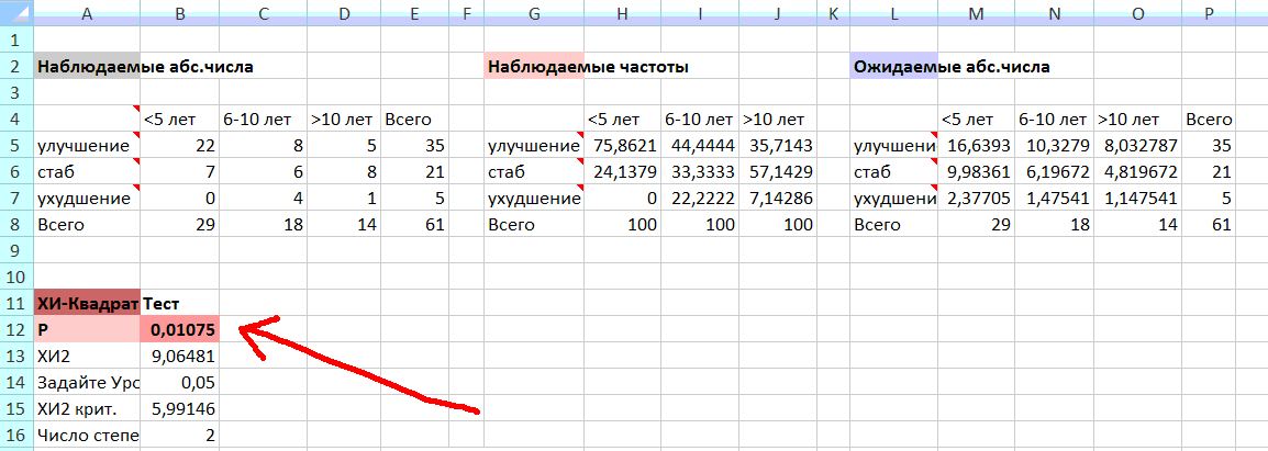 Если это не очень сложно - DoctorStat, помогите Смотрите распечатку программы http://doctorstat.narod.ru в приложенном рисунке. Вычисленный уровень значимости р=0,01<0,05 говорит о том, что три группы пациентов с различной длительностью заболевания различаются по результату лечения.