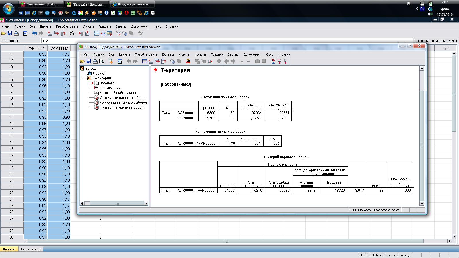 Сравниваю два ряда значений. Задача: рассчитать достоверность различий между средними показателями этих двух рядов. Мне научный руководитель сказал, что верно использовать конкретное значение показателя р, а не больше, не меньше допустим, 0,05. Например, р=0,094 Как в данной программе рассчитать конкретное значение показателя р? Я выбираю такой порядок: выделяю два ряда значений, выбараю: Анализ-Сравнение средних-Т критерий для парных выборок, подставляю ряды И нажимаю ОК Появляется табличка, в которой указано Среднее значение для каждого ряда, ошибка среднего значения для каждого ряда, доверительный интервал для каждого ряда и для двух рядов сразу при показателе достоверности в 95% А где указан показатель р, значение которого надо указывать конкретно? Прикрепляю скриншот для данного случая Где в результатах подсчёта значение р-? Сообщение отредактировал docanton - 17.03.2010 - 02:11 |