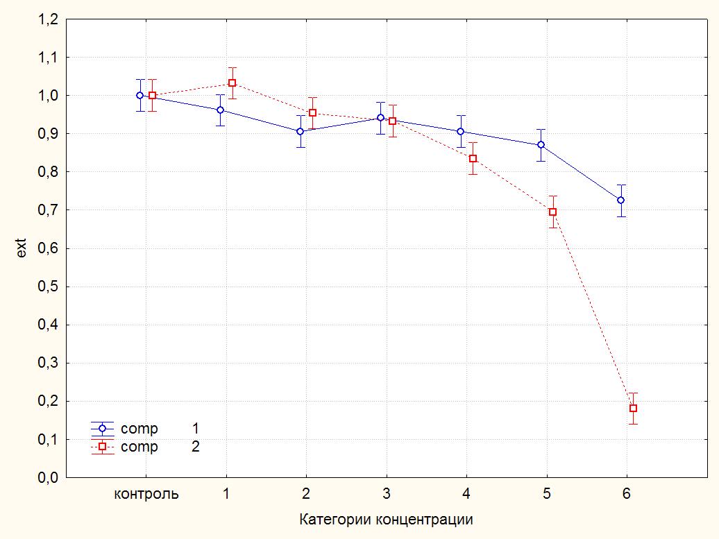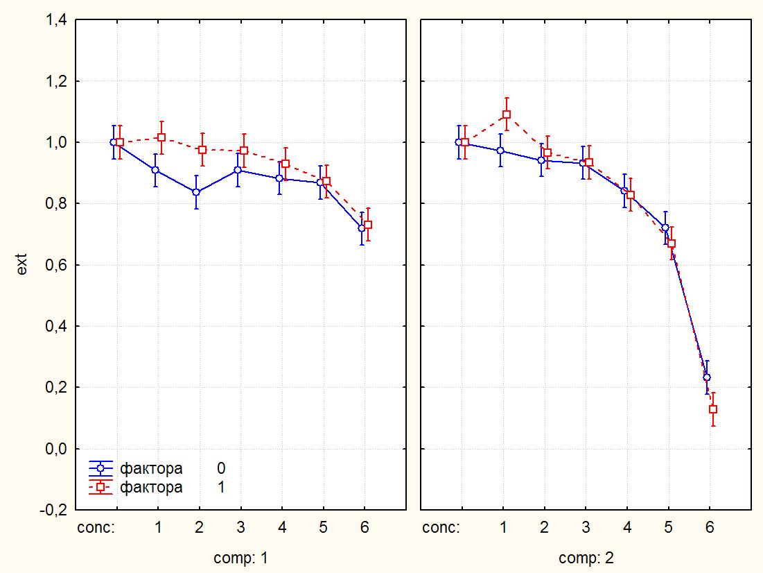 А чтобы ответить на вопрос б) посмотрите на график или используйте другой критерий post-hoc, чтобы доказать, что вещества 1 и 2 различаются по своему воздействию в концентрациях 5 и 6 (0,04 и 0,08).
