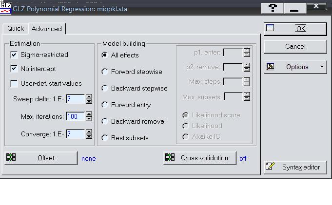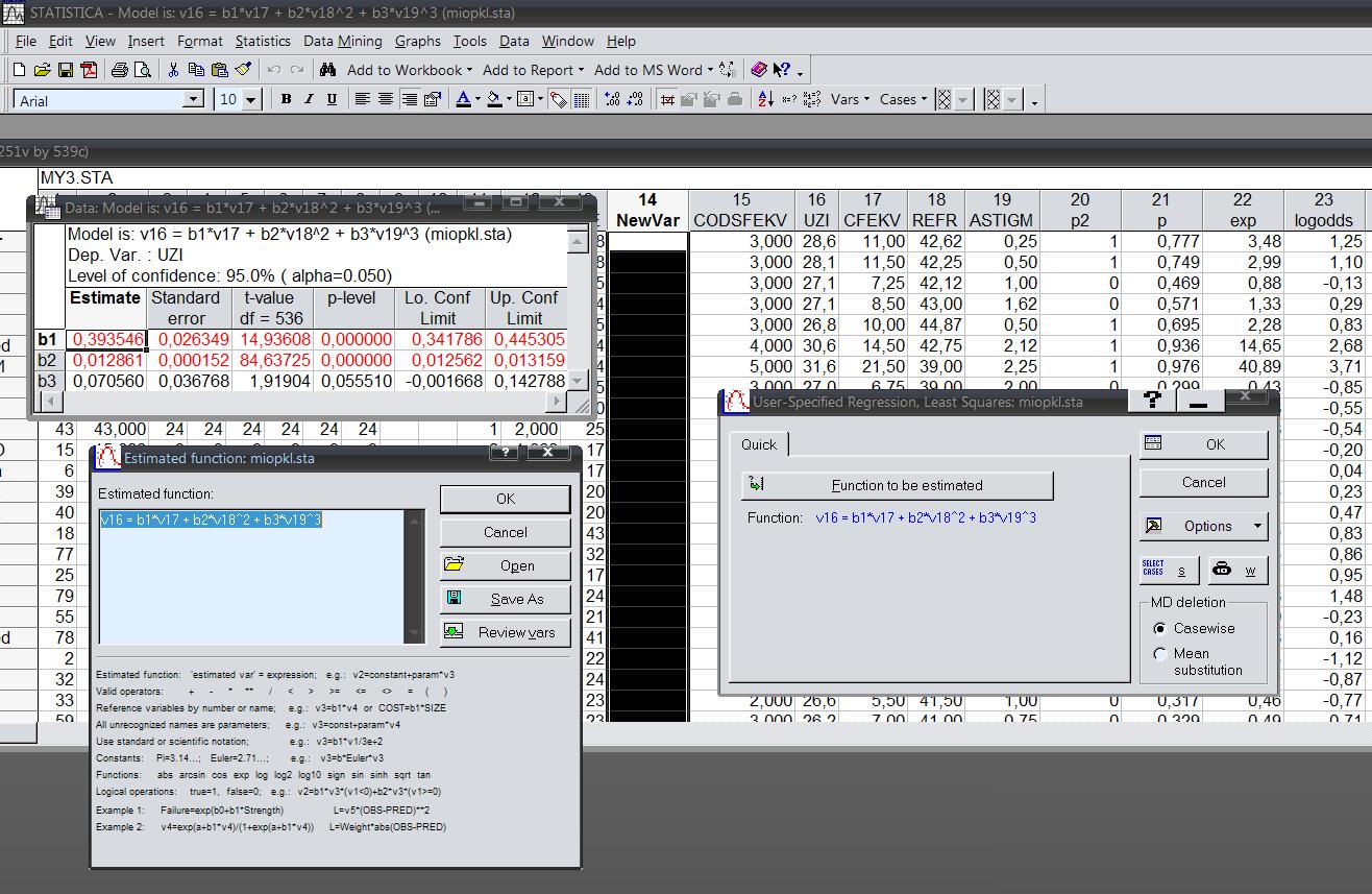 Никто не знает, как в Statistica исключить из полинома свободный член? Т.е. надо оценить параметры уравнения y = b1*X + b2*X^2 + b3*X^3 (без b0). Да и вообще для любых других функций, как можно это сделать? В каком модуле? Обычно на закладке Options окна выбора переменных есть соответствующий чебокс. |