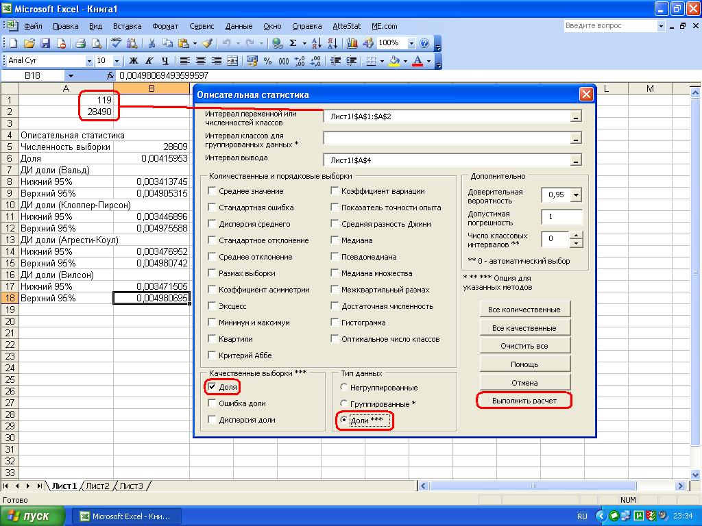 Второй вариант, расчет по выборке, что куда вводить. Например, нужно посчитать распространенность на 1000 жителей, если известно, что в выборке из 28609 жителей за определенный период 119 больных. Помогите, очень нужно сделать это в AtteStat, хотя есть предоставленный плавом clopper.xlsx , дает возможность посчитать ДИ пятью методами. Можно посчитать и тут, Testing Population Proportion http://www.wessa.net/rwasp_hypothesisprop1.wasp#output Методов расчета ДИ много, в пришпиленнос файле, полезный ресурс также в xlsx, реализован метод, на который все чаще ссылаются в зарубежных работах, автор метода (Newcombe RG) был консультантом в этой разработке. Сообщение отредактировал DrgLena - 20.09.2010 - 17:58