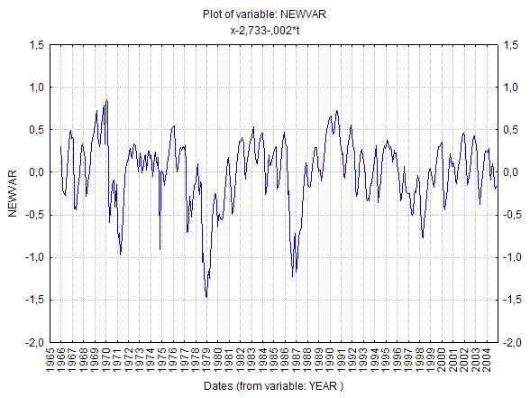 В пакете Статистика во временных рядах вычесть тренд. Только учтите, что в Вашем ряду пропущены данные за 1975 и 1978 гг. Поэтому и прилагаемый рис. получается со смещением. Но сначала нужно было бы исключить сезонную компоненту, для чего, например, перейти к среднегодовым значениям. Если рассматривать атмосферные осадки, то к сумме годовых осадков. Спасибо. 1. А что делать, если тренд - полином какой-нибудь степени? Это реализовано в пакете Статистика? 2. Как оценить какую часть дисперсии в ряду выбирает тренд? |