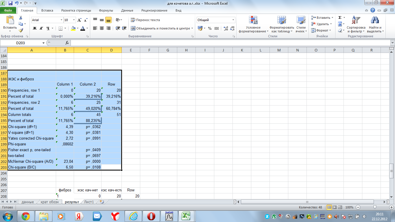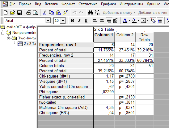 Вы можете еще больше принести пользы читателям этой ветки, если поясните как вы заполнили таблицу 2х2, где строки, а где колонки. Сколько у вас больных с фиброзом и сколько с ЖТ? А-есть фиброз в миокарде и Желудочковая тахикардия ; В-нет фиброза и ЖТ; С-нет фиброза,есть ЖТ; Д- нет фиброза и ЖТ - это ваше описание групп. По вашему описанию групп такая таблица, как в скриншоте, никак не может быть получена. Где то вы изначально ошиблись. А потому можете сделать не верный вывод о связи двух признаков. Вас DoctorStat правильно направил ? ?на четыре группы по факту наличия или отсутствия 2-х признаков: фиброз (+/-), тахикардия (+/-)? . А у вас фиброза нет В, С, Д и только А есть. А В и Д чем отличается? я ошиблась при описании групп,в группе В- нет фиброза и есть ЖТ. |