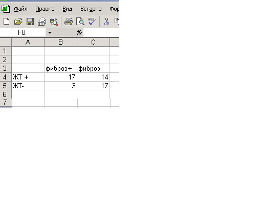 ЖТ+Фиброз+ 17 больных ЖТ+Фиброз- 14 ЖТ- Фиброз+ 3 ЖТ - Фиброз - 17 таблица фиброз + фиброз - ЖТ+ 17 14 ЖТ- 3 17 Спасибо.