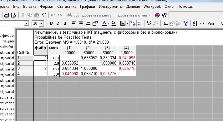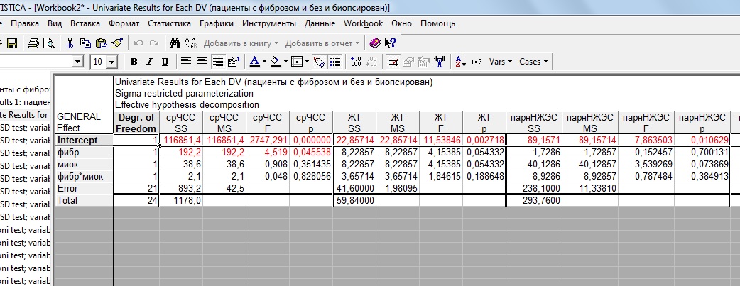 51 пациент, все выполнена мрт сердца . Выявлен фиброз в миокарде у 20 больных. 25 из 51 выполнена биопсия миокарда. Из них у 6 больных с фиброзом по МРТ выявлен миокардит при биопсии, а у 4-х нет миокардита. У 15 оставшихся больных с биопсией по МРТ ни у кого нет фиброза. Но у 6 по биопсии выявлен миокардит, а у 9-ти нет миокардита. Необходимо установить имеются ли различия у пациентов по функциональным параметрам ЛЖ, уровню тропонина, СРБ, NT-pro-BNP , ЖЭС,ЖТ ,ТШХ,ФК . Два фактора группирующих: фиброз :есть, нет, миокардит:есть, нет. По результатам дисперсионного анализа и апостериорного анализа ( критерий Ньюмена) получилось следующее ( прикрепила данные). Фактор фиброза влияет на ср ЧСС, ЖТ и тропонин. Фактор миокардита на ТШХ и ФК. По критерию Ньюмена выявлена статистически значимая разница по ЖТ в группе больных с наличием фиброза, но без миокардита по сравнению с группой больных без фиброза, но с миокардитом. А также выявлена статистически значимая разницап по ЖТ в группе больных без фиброза и без миокардита с группой больных без фиброза,но с миокардитом. А также статистически значимая разница в группе больных по уровню тропонина в гурппе больных с фиброзом и миокардитом по сравнению с группой больных без фиброза и миокардита. Спасибо за комментарии. |