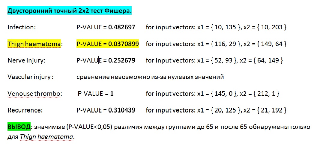 Уважаемые коллеги, очень надо на завтра С помощью программы "электронная таблица", взятой с моего сайта я посчитал P-VALUE отличий двух групп для каждого осложнения из первой таблицы, смотри приложенный рисунок.Исследование проведённое с пациентами, которых мы прооперировали по поводу варикозных вен нк. Две группы, до 65 и после 65. Хотим показать, что по осложнениям нет существенной разницы между двумя группами. То есть, что операции после 65 не более рискованы, чем до 65. Я вообще не знаю как считать Р. Буду очень благодарна если объясните. Таблицу прилагаю. Спасибо заранее! ![]() Просто включи мозги => http://doctorstat.narod.ru