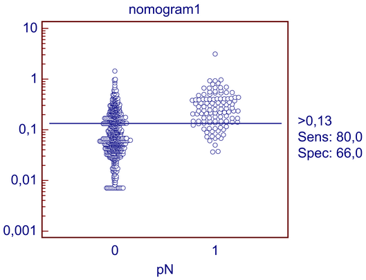 Спасибо за ответ! Цель исследования-внешняя валидизация номограммы. Есть база данных из 700 пациентов, которым выполнялась удаление тазовых лимфоузлов (т.е. гистологичесое подтвержение наличия или отсутствия метастазов). Для каждого из этих случаев по номограмме вычислена вероятность наличия метастазов в процентах (с помощью он-лайн ресурса nonogram.org) По полученным данным проведен roc-анализ, auc составила 0,795, что не плохо, номограмма работает на наших пациентах. но необходимо ее откалибровать, построить график предсказанная вероятность-наблюдаемая вероятность, что бы изучить отклонение предсказанных результатов от диагонали. На сколько я понял, это делается с помощью метода local regression smothing, но как это сделать, не знаю. пример базы данных загрузить не могу, пишет что мне это не разрешено, но выглядит это так: nomogram | pN 0,1 | 0 0,6 | 1 0,4 |0 и т.д На этом форуме всё кроме рисунков нужно прикреплять в виде rar или zip архива. Но я посмотрел ваши данные и обсуждение на молбиоле. Полагаю, что помимо сделанного ещё можно: (1) статистически доказать отклонение реальных данных от предсказанных. Критериями типа хи-квадрат с использованием в качестве наблюдаемых значений - ваши данные, а в качестве ожидаемых - тех, что советует номограмма. Не проверял, но похоже будет значимое отличие. (2) найти оптимальную точку разделения именно для ваших данных. Для первой номограммы оптимальное значение (минимум ложноположительных и ложноотрицательных прогнозов) равно 0,13 (получил в MedCalc, но должно быть где-то и в R). Конечно, это намного меньше 0,5 и каким-нибудь бутстрепом это можно доказать статистически даже не прибегая к пункту (1). При cut-off=0,13 чувствительность составляет 80,9%, специфичность - 63,5, в логарифмической шкале почему-то немного иначе: соответственно 80% и 66% (см рис). Сообщение отредактировал nokh - 23.09.2013 - 19:36 |