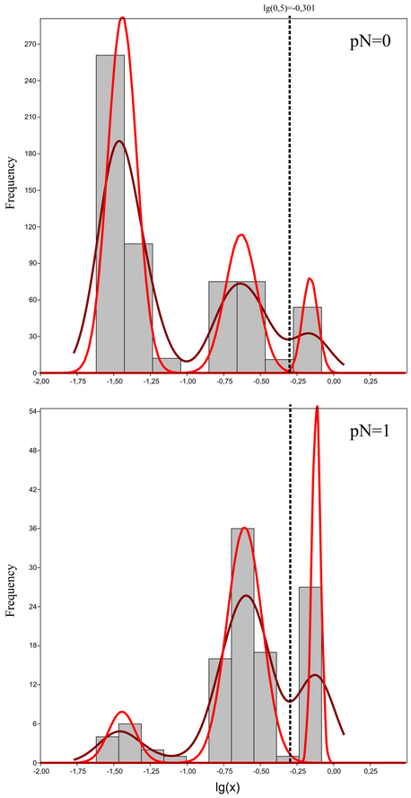 Характер распредления кружков на графике говорит о возможной гетерогенности групп, по крайней мере "0". Посмотрел плотность распредления вероятности отдельно для 0 и 1, благо объём выборки позволяет. Начну с номограммы 2, т.к. насколько понял, именно она рекомендована сейчас. На рис. по оси х отложил десятичные логарифмы вероятностей, опираясь на число мод на графиках плотностей провёл разделение смеси распределений. Что имеем?