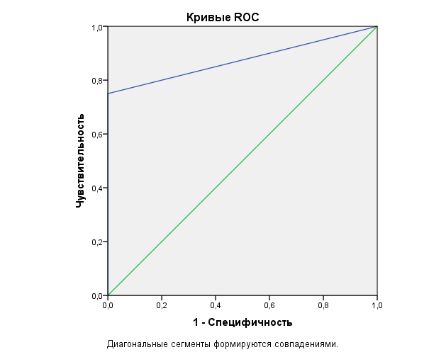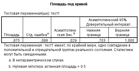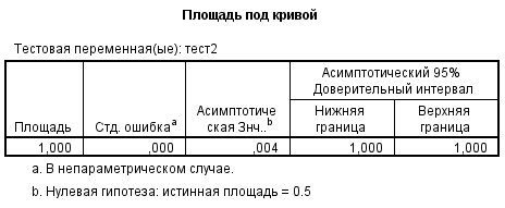 В случае идеальной полной (100%) предсказательной (диагностической) способности "качественного" теста площадь под кривой равна 1, асимптотическая значимость 0,004!!!