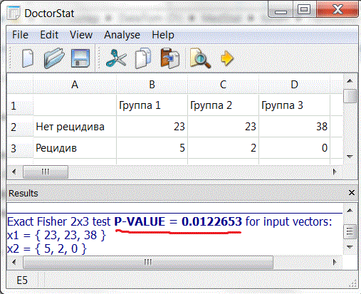 1 группа 28 человек - 5 рецидивов. 2 группа 25 человек - 2 рецидива. 3 группа 38 человек - 0 рецидивов. Пытался использовать точный критерий Фишера для таблицы 2хN программа DoctorStat, однако возникают мысли, а точно ли она правильно работает? Сообщение отредактировал DoctorStat - 27.11.2014 - 21:59 ![]() Просто включи мозги => http://doctorstat.narod.ru