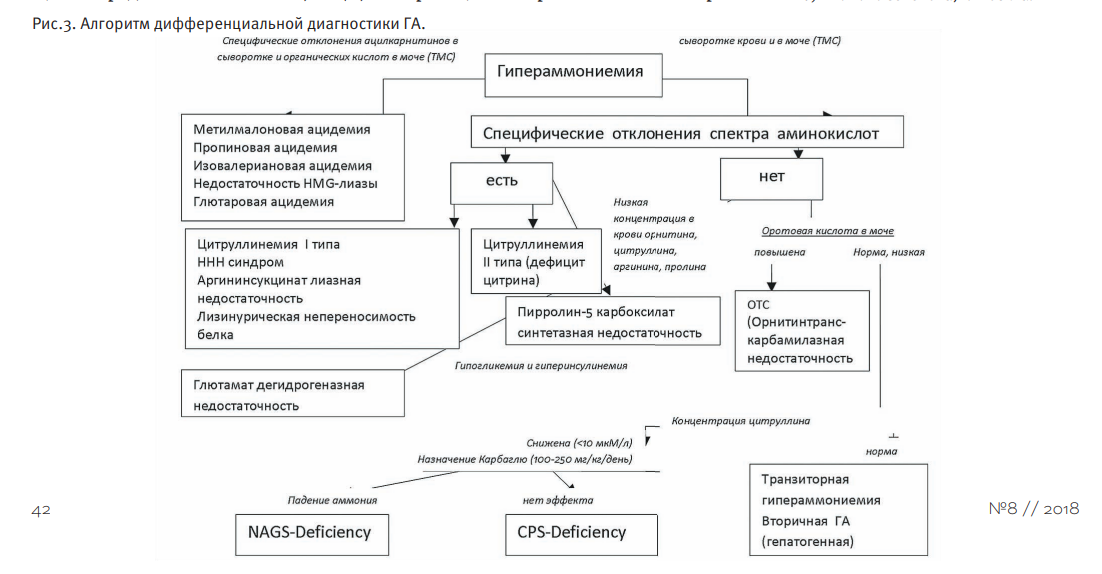 Всем Ваша история ещё раз доказывает, что нужно узнать первопричину проблемы, а не маскировать симптомы, подбирая рацион пищи и перебирая пробиотики и бады. На данный момент тоже пытаюсь выяснить причину гипераммонемии у себя и сына, и с первых двух заходов генетики отказались проводить исследования, ограничившись тандемной масс-спектрометрией и измерением уровня аммиака. С другой стороны по органам исследовано почти всё и никаких особых отклонений не найдено. Как минимум 2 специалиста мне говорят, что генетика не исключена и нужно продолжать исследования, но генетики не видят смысла этого делать. Обратился в более крупный институт генетики, жду их заключения. Параллельно с этим удалось найти цикл статей из 3 штук по гипераммонемии (http://spiporz.ru/raremagazine/wp-content/uploads/sites/3/2018/02/REDKIJ-ZHURNAL-8.pdf), в котором всё предельно понятно расписано и даже есть алгоритм дифференциальной диагностики гипераммонемий. Привожу этот алгоритм из номера 8. В номере 7 дана классификация, а в номере 9 - способы лечения. |