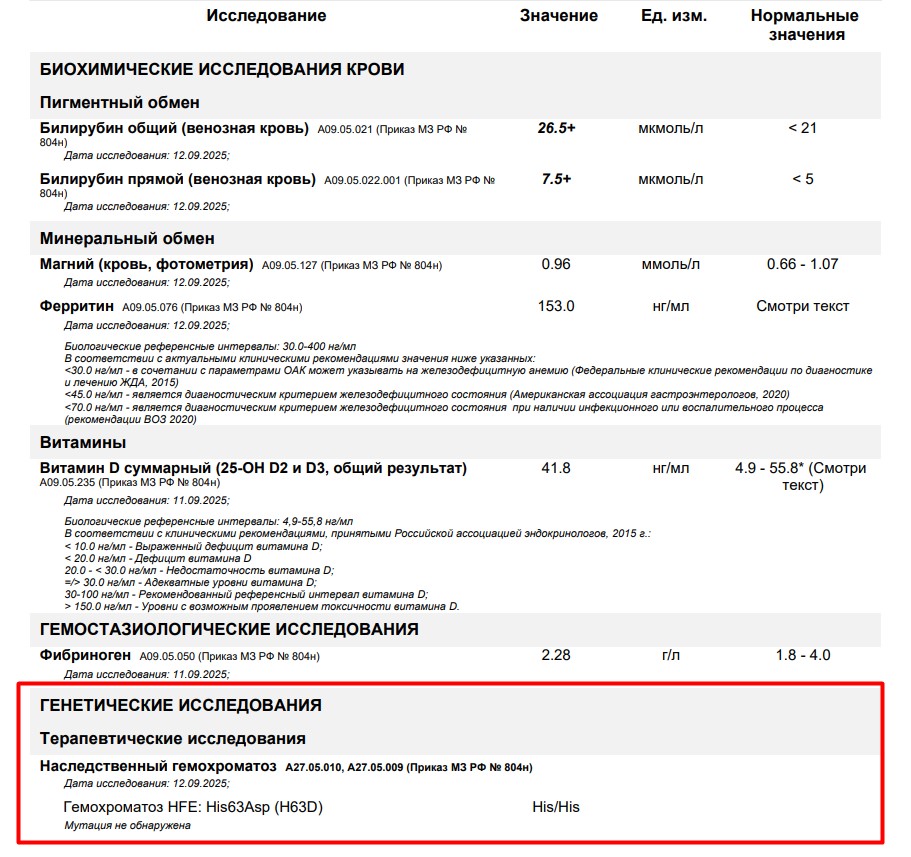 Заключение интересное, и я согласен с некоторыми выводами, но с другими, возможно, стоит подойти более критически. Что касается процентного насыщения трансферрина, то при подсчете по показателям железа и ОЖСС (Fe/OЖСС х 100) получается, что процент насыщения трансферрина составляет 57,1% (норма 17,8-43,3). Увеличение этого процента выше 55% (до 90%) действительно указывает на необходимость исключения гемохроматоза. Это важный момент, и да, коэффициент насыщения трансферрина в 57% может указывать на проблему с железом, так что для диагностики гемохроматоза требуется более специализированное обследование, включая анализы на генные мутации. Очень важно учитывать не только референсные значения, но и соотношение отдельных показателей - молодец, что обратил внимание на этот момент. Что касается перегрузки железом, то она действительно может привести к повреждению печени, фиброзу и циррозу. По расчёту Fib4 фиброз печени с высокой вероятностью исключается, но всегда стоит помнить, что такие расчёты могут иметь определённый процент ошибок. Поэтому, если есть признаки перегрузки железом, эластометрия печени будет оправдана для более точной диагностики. Что касается аммиака и его возможных отклонений, то согласен, что неправильно проведённый забор крови или задержка могут влиять на результаты. Но если аммиак всё-таки повышен, это требует более серьёзного внимания и дальнейшего обследования, а не оправдания ошибкой забора. Лечение аммиака (учитывая симптомы) и диагностику состояния печени нужно ставить в приоритет. Рекомендация по консультации другими специалистами выглядит разумной, но, на мой взгляд, они не должны подменять лечение возможной и очень вероятной гипераммониемии. Наконец-то дошли ноги сделать тест на гемохроматоз. Отрицательно. ![]() Синдром Жильбера гомозиготный, 45 лет. Рост 170, вес 74.