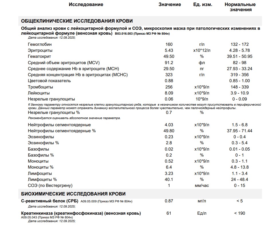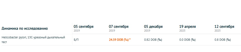 Goold, генетический гемохроматоз у вас исключён, ферритин в норме, перегрузки железом нет.билирубин соответствует СЖ. В остальном анализы хорошие: воспаления нет, анемии нет, амилазы тоже нет;), витамин D и магний в норме. Так что поводов для беспокойства по поводу железа точно нет. Кстати, лимфоцитоза в прикрепленных анализах тоже нет, и даже нейтропении нет - лейкоформула в норме. В общем, все отклонения сведены к небольшому повышению билирубина Спасибо! Есть положительные моменты. Если помните историю мою с моим подозрением на подмену результатов биопсии при ФГДС. Сдал дыхательный тест на хеликабактер. Снова отрицательно. Upd. Подозреваю, что в апреле забор воздуха был произведен не правильно. Сообщение отредактировал GooolD - 15.09.2025 - 13:14 ![]() Синдром Жильбера гомозиготный, 45 лет. Рост 170, вес 74.