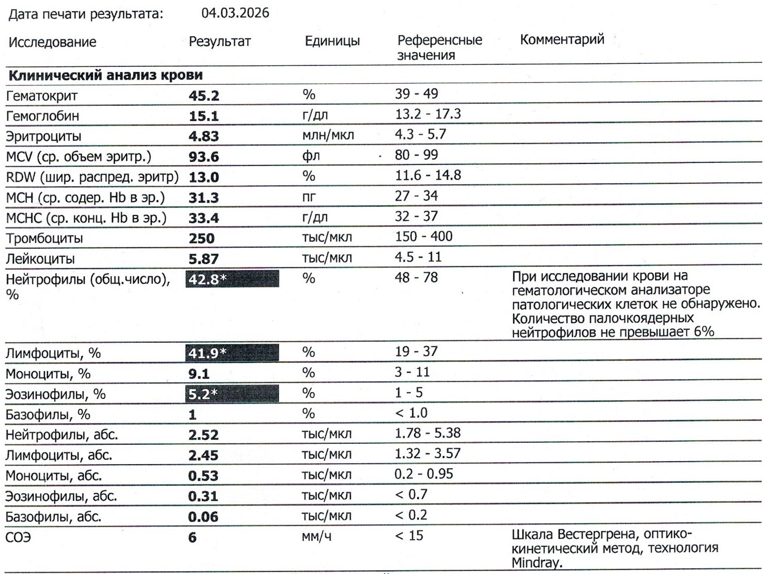 Кстати, хотел бы уточнить ещё один момент - на фоне повышения КФК не замечали ли вы мышечной слабости (сложнее вставать со стула, подниматься по лестнице), быстрой утомляемости мышц или ощущения скованности как после тренировки, но без нагрузки, тянущие, ноющие боли чаще в бёдрах, икрах, плечах? Если такие жалобы есть - то повышение КФК уже нельзя считать случайным. И ещё один уточняющий момент: не было ли эпизодов заметного потемнения мочи (не связанного с питанием или гидратацией), особенно после нагрузок? Иногда при умеренном повышении КФК (как у Вас) пациенты отмечают потемнение мочи, при этом анализ остаётся без особенностей. Это возможно, поскольку небольшие количества миоглобина могут менять цвет мочи, но быть ниже порога лабораторной детекции и быстро выводиться. Поэтому отсутствие изменений в анализе не всегда исключает умеренный мышечный компонент. И заодно: могли бы уточнить какой сейчас уровень ТТГ и уровень калия (К+), не проверяли ли эти показатели в последнее время? И отдельно: с учётом односторонних неврологических жалоб теоретически обсуждается и шейный уровень, поэтому при выполнении МРТ с контрастированием более рационально сразу оптимизировать протокол и включить также шейный отдел, чтобы получить одномоментную оценку всей потенциальной зоны интереса и избежать необходимости повторного контрастного исследования в случае расширения диагностических вопросов. Ocean_ovna, благодарю за развернутый ответ и анализ ситуации! Добрался до анализов - уровень КФК был 352 Ед./л при норме 171, при этом КФК МВ 30,3 Ед./л. По мониторингу ЭКГ правожелудочковые экстрасистолы 484, парные мономорфный ЖЭС - 1, предсердные и нижнепредесердные желудочковые ЭС - 6. МРТ шейного отдела с контрастированием пока не вижу смыла делать, так как установлена зависимость неврологических симптомов от других уже устраненных факторов, но симптомы, к сожалению, так быстро не проходят, нужно около года. Мышечной слабости не ощущал, физические нагрузки есть каждый день (стройка), чаще всего умеренные. Но именно перед сдачей анализа на КФК в течение суток нагрузок как раз практически не было. Потемнение мочи отмечал пару раз, но зависимости от нагрузок или чего-либо не обнаружил. ТТГ и калий давно не измерял, но по предыдущим анализам ТТГ два года был в норме, а калий всегда был в норме. По анализу крови лимфоцитоз именно относительный (прикладываю). После лечения от хеликобактер пилори планирую примерно через месяц повторить некоторые анализы, чтобы понять, есть ли изменения. Сообщение отредактировал Lapin - 19.04.2026 - 11:01 |
