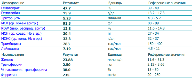 Не ограничивайтесь только общим анализом крови. Чтобы исключить маскировку дефицита на фоне гемоконцентрации, необходим полный профиль: 1. Ферритин (учитывая, что при воспалении он может быть ложно завышен). 2. Сывороточное железо + ОЖСС (TIBC). 3. Насыщение трансферрина железом (TSAT) - самый важный показатель в нашем случае! 4. СРБ (CRP) - чтобы понять, не маскирует ли воспаление уровень ферритина. В моем случае в январе 2024 года (именно когда были состояния близкие к обмороку) эти анализы выглядели так (прикладываю). Все показатели в норме, по ферритину даже скорее ближе к максимуму, СРБ тоже был в норме. Я всё-таки склонен полагать, что это были симптомы интоксикации, возможно не только аммиаком (он тогда был в районе 70), но и органическими кислотами, которые я сдавал значительно позже. |