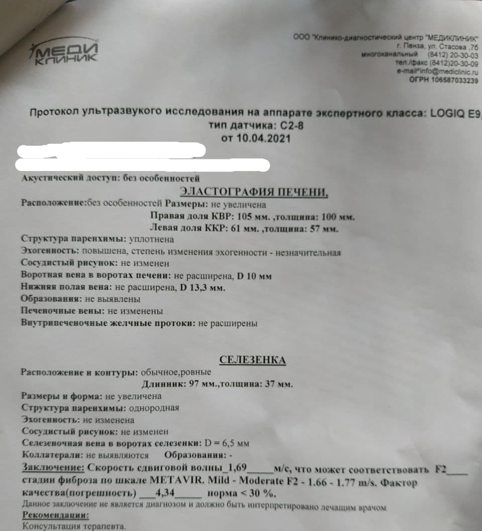 По большому счету F2 это почти здоровая печень), по мнению большинства гепатологов, но причину в любом случае установить очень желательно, так как это может быть ключевым моментом если не для уменьшения фиброза, то хотя бы к замедлению его прогрессирования.