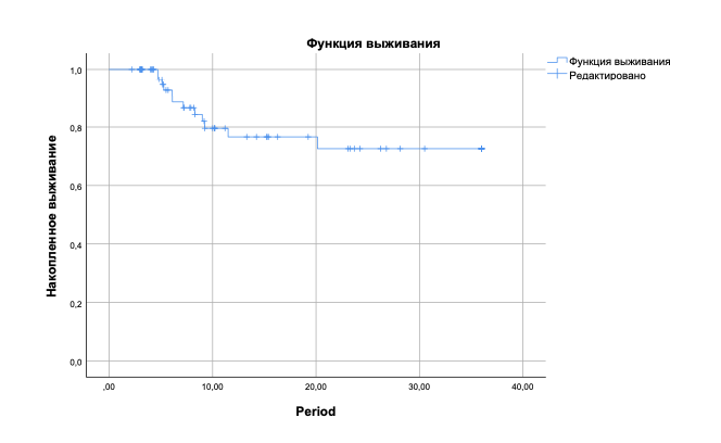 Если я считаю безрецидивную выживаемость по формуле, то я получаю 88,9%. На кривой Каплан-Майера если смотреть по координатам x и y - я вижу значение около 80%. Почему так? Скорее всего я не правильно считал в ручную значение выживаемости. Так как я считал от общей группы т.е. {( группа пациентов - группа пациентов с рецидивом)/группа пациентов} т.е. расчет обычной пропорцией, что не может совпадать с графиком. Как посчитать выживаемость на определенный период времени по формуле? |
