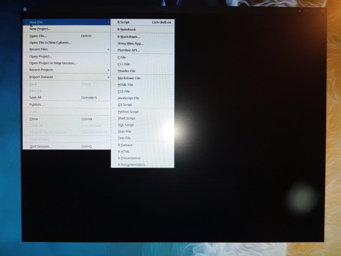Один из тестов пока провалили все - не удаётся нормально запустить Rstudio. Пробовал на лёгких версиях Ubuntu (Lubutu, Xubuntu, отечественная runtu), на Mint и на чистом Debian 10. Рабочий стол везде Xfce, т.к. ни на LXQt, ни на Mate (пробовал разные оболочки в разных линуксах) RStudio вообще экрана не выдала. В трёх случаях запустилась, но с предложением отправить crash report. Картина везде идентичная, поэтому надеюсь, что какими-то настройками исправить можно. После сообщения об ошибке остаётся чёрный экран со стрелкой курсора. На П и Л кнопки мыши откликается, а если покликать в верхней части - появляются пункты меню, но самого меню не видно (см. скриншот). Но если в менюшках что-то выбрать - что-то происходит судя по отклику жёсткого диска, но результат не виден, т.к. чёрный фон всё забивает.
