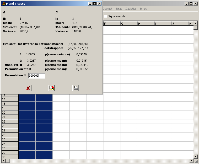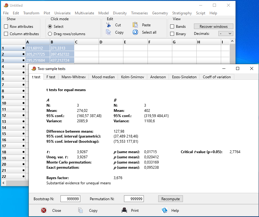 Можно поиграться и бутстрепом, тогда не будет противоречия ни в ДИ для средних, ни в ДИ для разности: 274,0 [221,6; 305,2] и 402,0 [371,3; 437,2] для процентильного метода, ДИ не перекрываются Разность 128,0 [75,6; 177,8] Всё можно посчитать в PAST https://www.nhm.uio.no/english/research/resources/past/ О, новый ПАСТ пермутит по-новому! У меня так: При том, ни то, ни другое p, я "вручную" повторить не смог. Кстати я так и не понял, в какое ему место заглянуть, чтобы узнать версию своего. Чем Паст хорош - скорость. На своем древнем компе я так и не дождался 999999 псевдовыборок на чистом R, в ПАСТе же оно почти мгновенно происходит. Чем он плох - х. з., что именно считает. Например, методом научного тыка было доказано, что бутсреп-ДИ для разности средних ПАСТ считает вовсе не методом процентилей, как Вы заявляете, а методом basic - наименее ненадежным из существующих. |