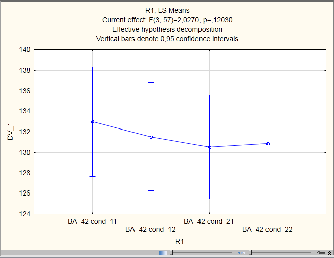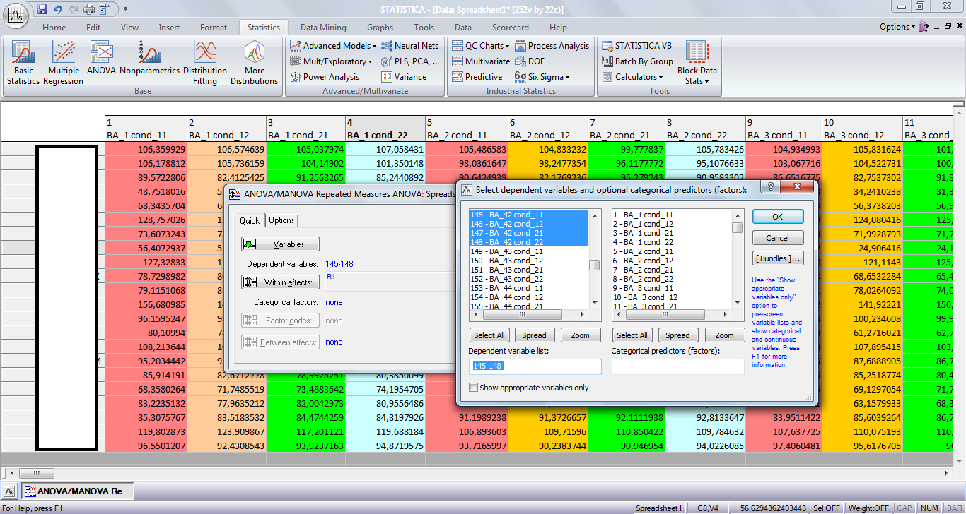 Вставляю эту таблицу в STATISTICA, жму Repeated measures ANOVA, в Variables выбираю четыре скана для одного региона интереса, в Within effects пишу 4.
