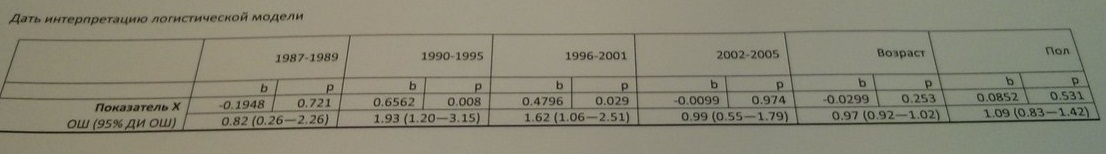 Помогите решить задачу по медицинской статистике, пожалуйста! Необходимо дать интепретацию логистической модели, представленной на рисунке. Заранее спасибо.
