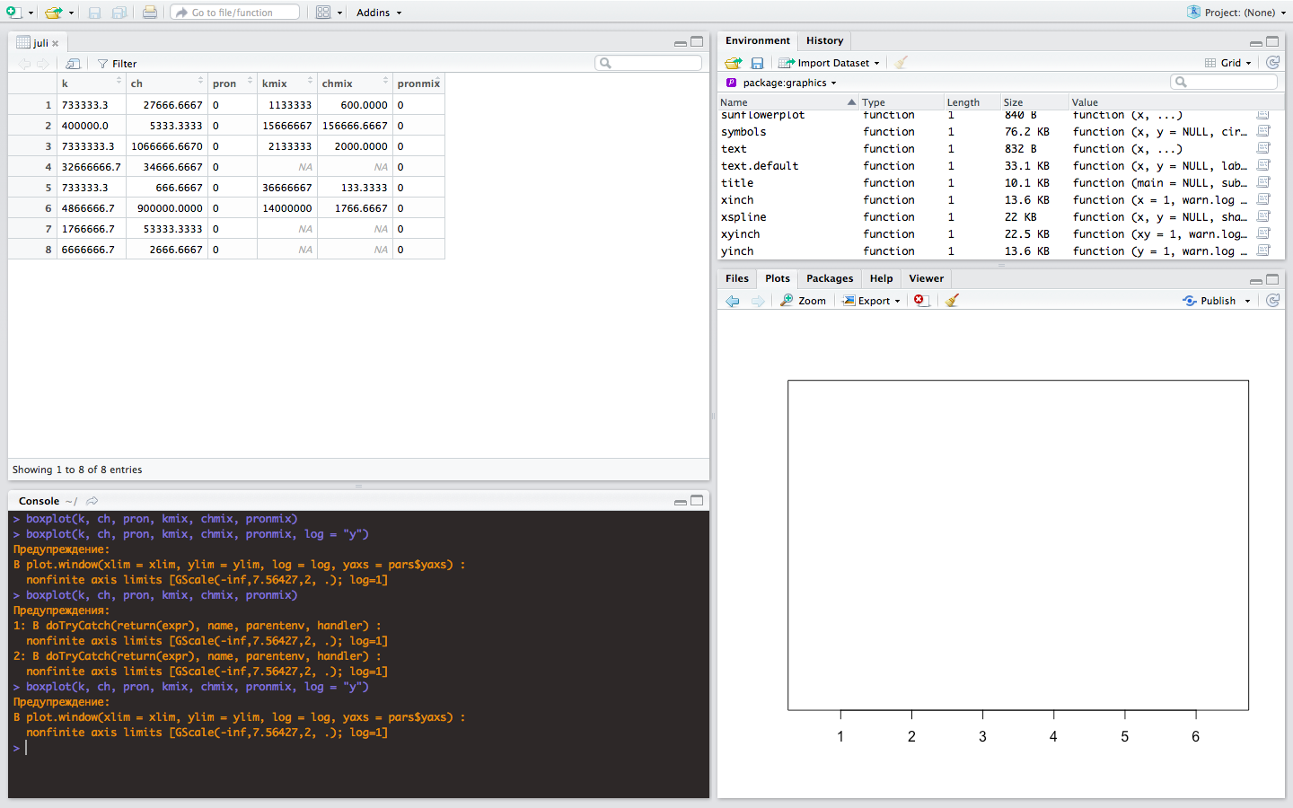 При использовании команды: > boxplot(k, ch, pron, kmix, chmix, pronmix, log = "y") все куда-то исчезает.