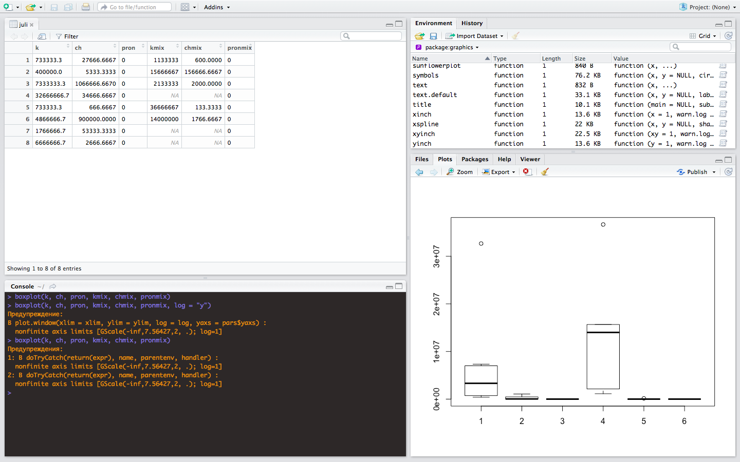 Задача: построить ящики с усами для 6 выборок, но чтобы шкала Y была логарифмической. При использовании команды: > boxplot(k, ch, pron, kmix, chmix, pronmix), где k, ch, pron, kmix, chmix, pronmix - названия векторов с данными получается построить ящики с усами, но без лог шкалы.