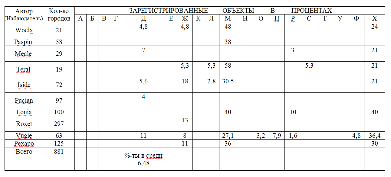 Так вот. Различные наблюдатели в разных населённых пунктах (условно городах) регистрировали определённые объекты. Объекты классифицированы и обозначены буквами алфавита, регистрировалась их частота в процентах. Сколько всего городов наблюдали указано во втором столбце. Города не повторялись и у каждого наблюдателя был как-бы свой регион. Те объекты, которые не подходили под классификацию регистрировались как "другие" и в таблице не указаны. Поэтому, например, в третьей строке сумма всех процентов 31, то есть 69 не удалось отнести к какому-либо виду. А в третьей строке, наоборот, все объекты подходили под классификацию и в сумме дают 100%. Но цель не в этом. Надо выяснить сколько приблизительно объектов какого-либо типа приходится в целом на страну. В последней строке есть графа %-ты в среднем, вычисленные для объектов вида Д. Так вот, если вычислить такую цифру для всех типов объектов, то в сумме они оказываются более 100%. То есть средние значения процентов не подходят. В целом населённых пунктов (условно городов) по стране очень много, но суммарная цифра уже рассмотренных является как-бы достаточной выборкой для каких-либо выводов. Как исходя из этих данных можно хотя бы как-то высказаться о приблизительном проценте конкретного объекта в N-ом городе (или группе городов). Можно ли как-то аппроксимировать эти значения, чтобы сумма средних процентов была 100%? Я понимаю, был бы график, то можно было бы сгладить его регрессионной функцией или при помощи полинома. Но в данном случае надо выявить тенденцию в виде распределения по долям. Возможно задача банальная, просто я не встречался. Рад был бы узнать Ваше мнение на этот счёт. Заранее благодарю.